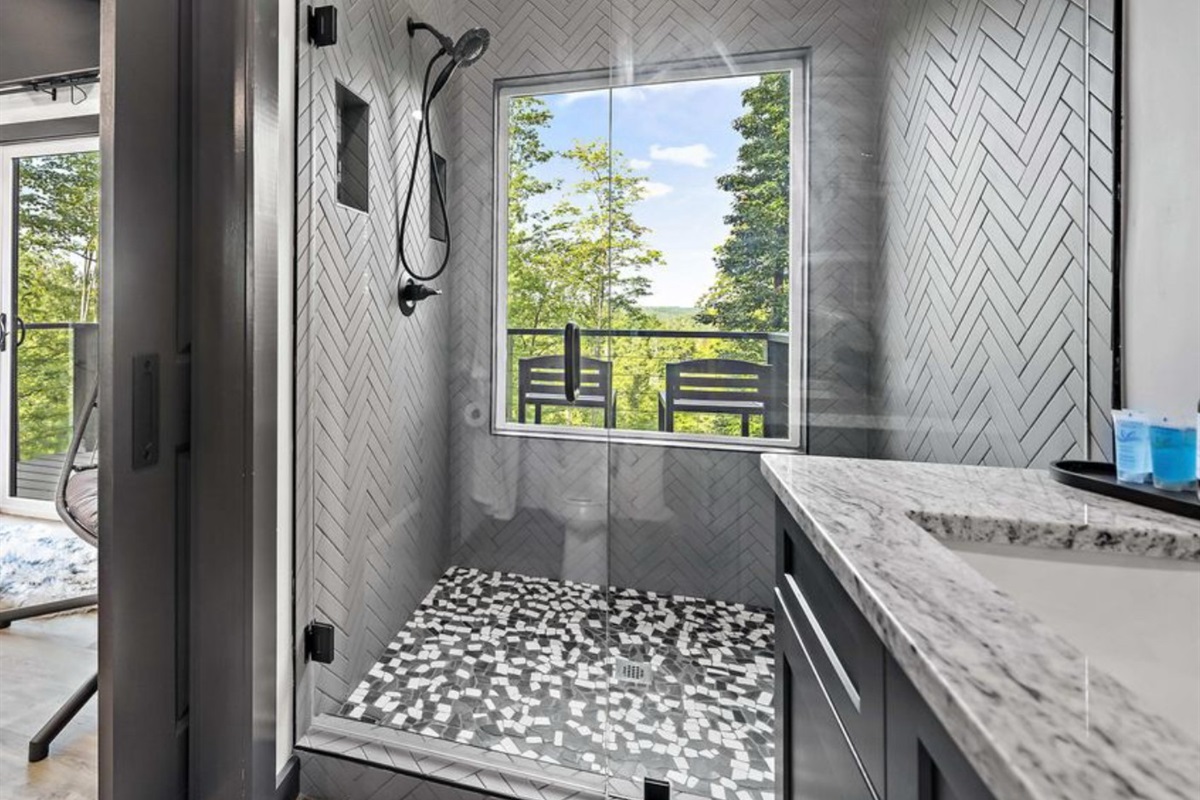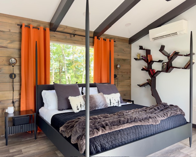 🛌 Sleep in Luxury – Second-floor suite with a forest-view walk-in shower, king bed, tree-shaped bookshelf, and smart TV